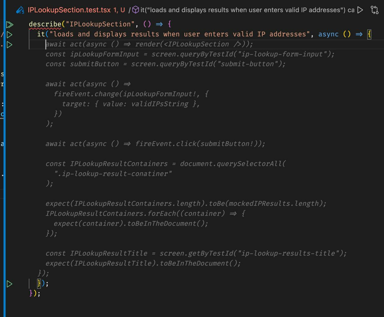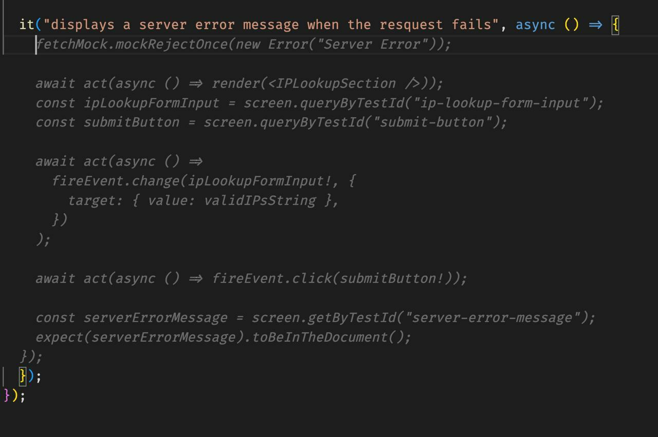 fireEventis no longer a recommended way to mock events in Tests. See @testing-library/user-event.IPLookupResultContainersvariable is assigned to elements on the page (querySelectorAll). Then why does the test calls.toBeInTheDocument()for them afterward?Some people don't like snapshots, but I think it might work nicely in this case - just take the snapshot of the page after the results are loaded - snapshots can also catch refactoring mistakes (i.e, you changed a valid class name to a typo accidentally).