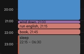 Even once 75% of your day is scheduled using repeated events, we can add some structure to the other 25%. I suggest coming up with a naming scheme for your events - do whatever works for you as it only needs to make sense for you.