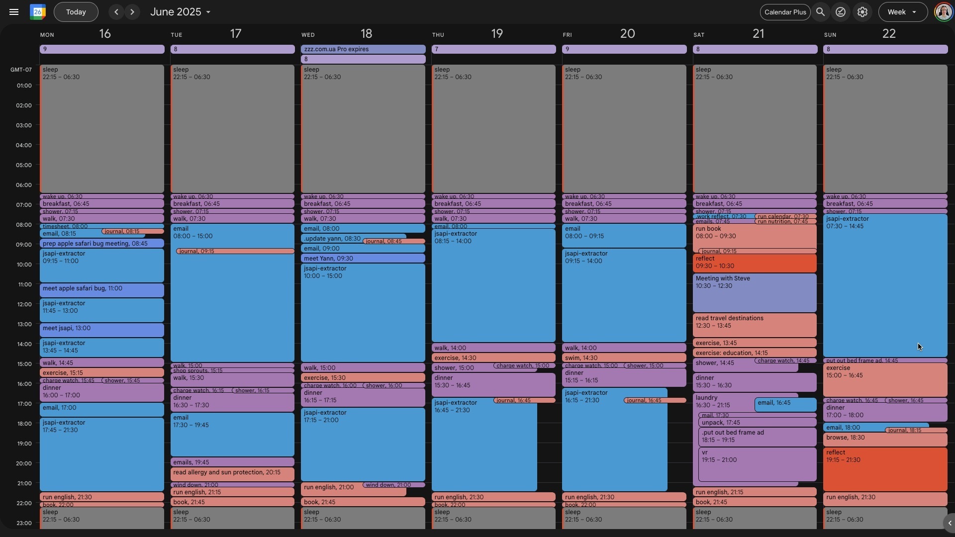 Putting sleep and meal time on the calendar is especially important as there are health benefits from doing those at a consistent time every day of the week (including weekends).