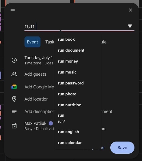 run <task>. Example:run money(monthly statement tracking and financial reflection),run book(time for deciding what book to read next and finding more great books to add to my library),run music(for curating my Spotify library),run photo(for cleaning up Google Photos albums),run nutrition(monthly reflection on my diet and search for new healthy&tasty ingredients or practical recipes),run digital(digital cleanup and password management). I use the wordrunas it is shorter thanmanaging.read <task>- for when I want to schedule a time to read up on a topic or research something. Example:read react docs,read typescript book,read new york rental marketprep <task>- for preparation ahead of an important event. Example:prep eye exam,prep dental cleaning,prep insurance documents,prep san francisco tripmeet <name>- for work meetings with peopletalk <name>- for non-work meetings with peopleshop <name>- for regular shopping runs. For example,shop sprouts(for grocery shopping),shop amazon(for online shopping).