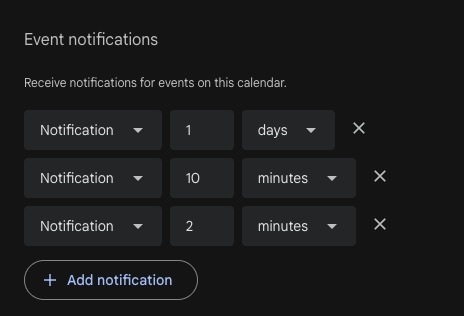 Work Meet: all work meetings and time-sensitive work (like preparation for a meeting). This is a separate calendar so that each event has a 10min reminder by default and is of slightly more visible color than the regular Work calendar even to stand out more. For virtual meetings that you don't need to prepare for, you can manually change the reminder to go off 0min before the meeting.