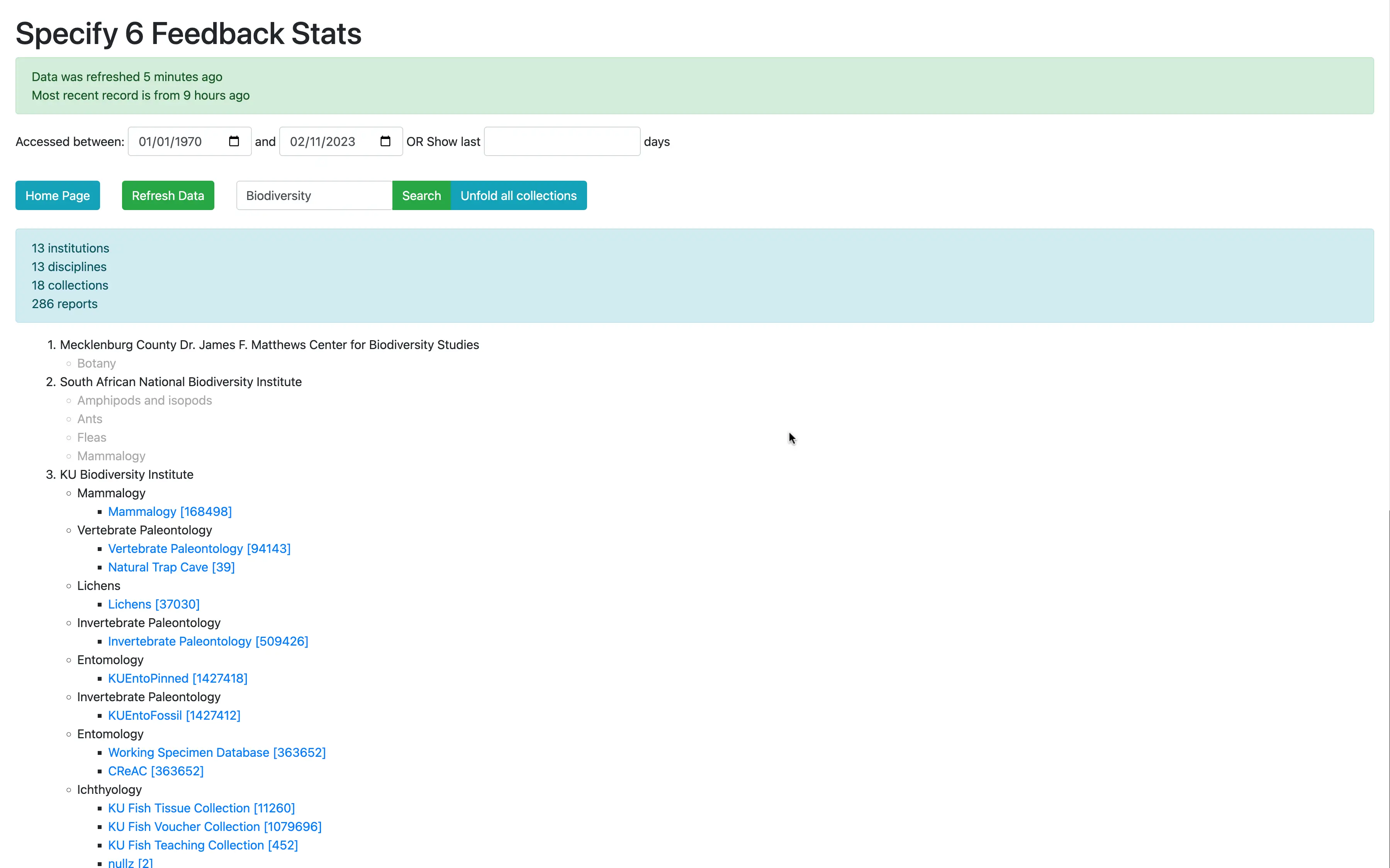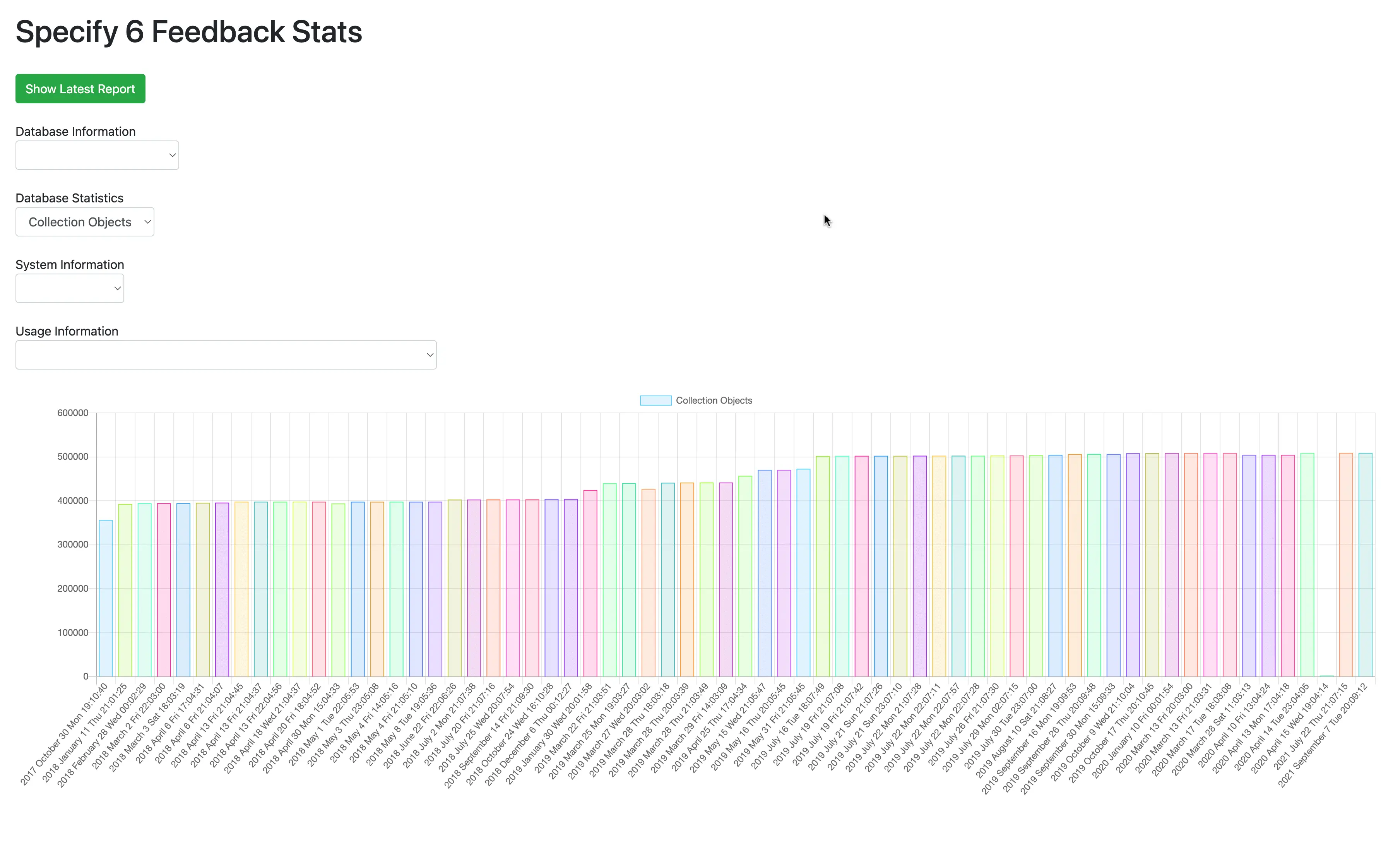 Specify 6 reports many metrics, including how often features are used and how big key database table there are. The stats visualizer allows to see user's database grows over time and how their usage patterns change. This also empowered our membership team to know when an institution decreased usage of Specify 6, and allowed them to follow up asking if assistance is needed.