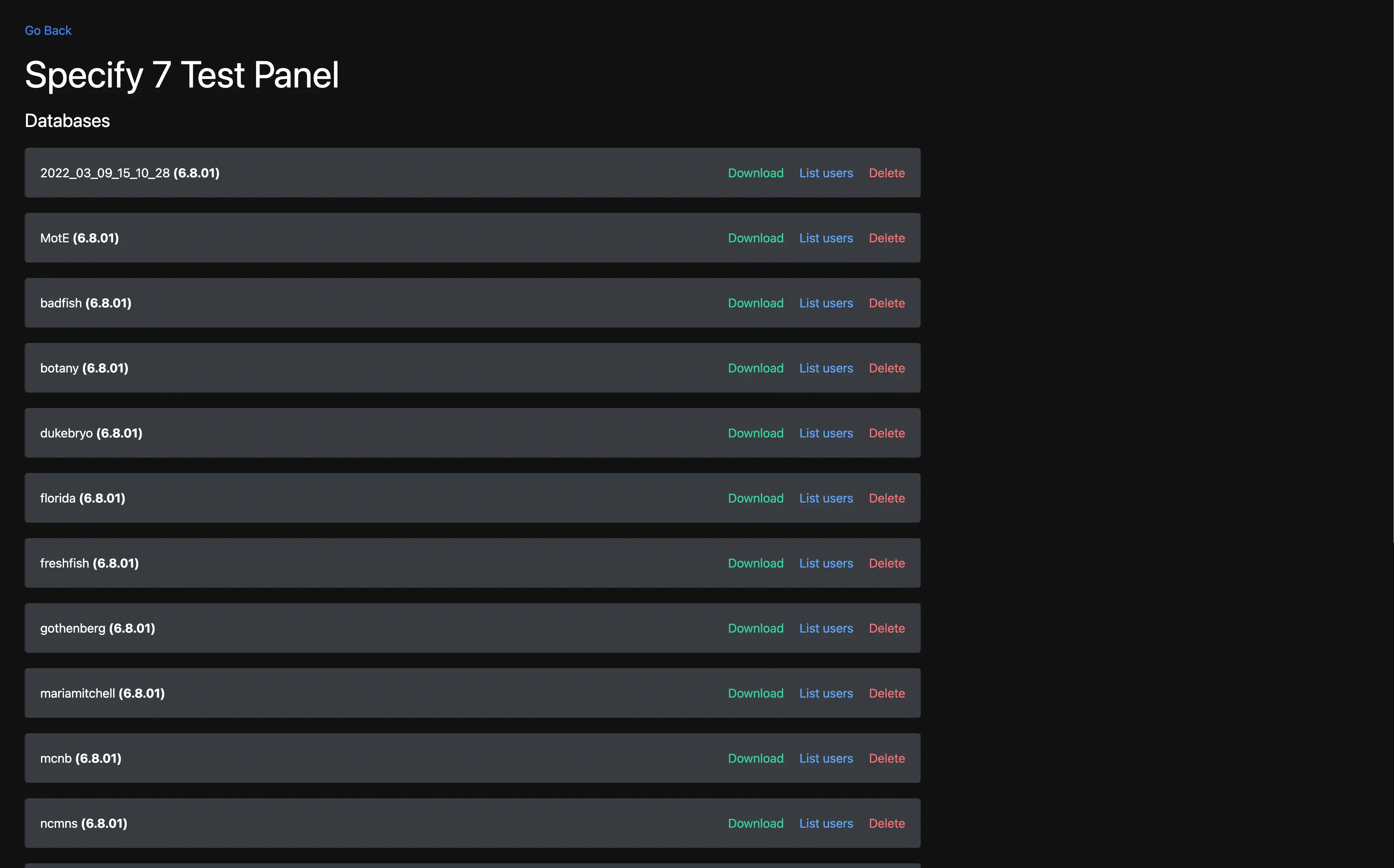 For security purposes, the test panel is protected behind a GitHub OAuth authentication, which only permits signing it with accounts that are members of the "specify" GitHub organization. Thus, even though a live version is available at test.specifysystems.org, the dashboard itself is inaccessible. If you want to try out the test panel, I encourage you to deploy it on your machine.